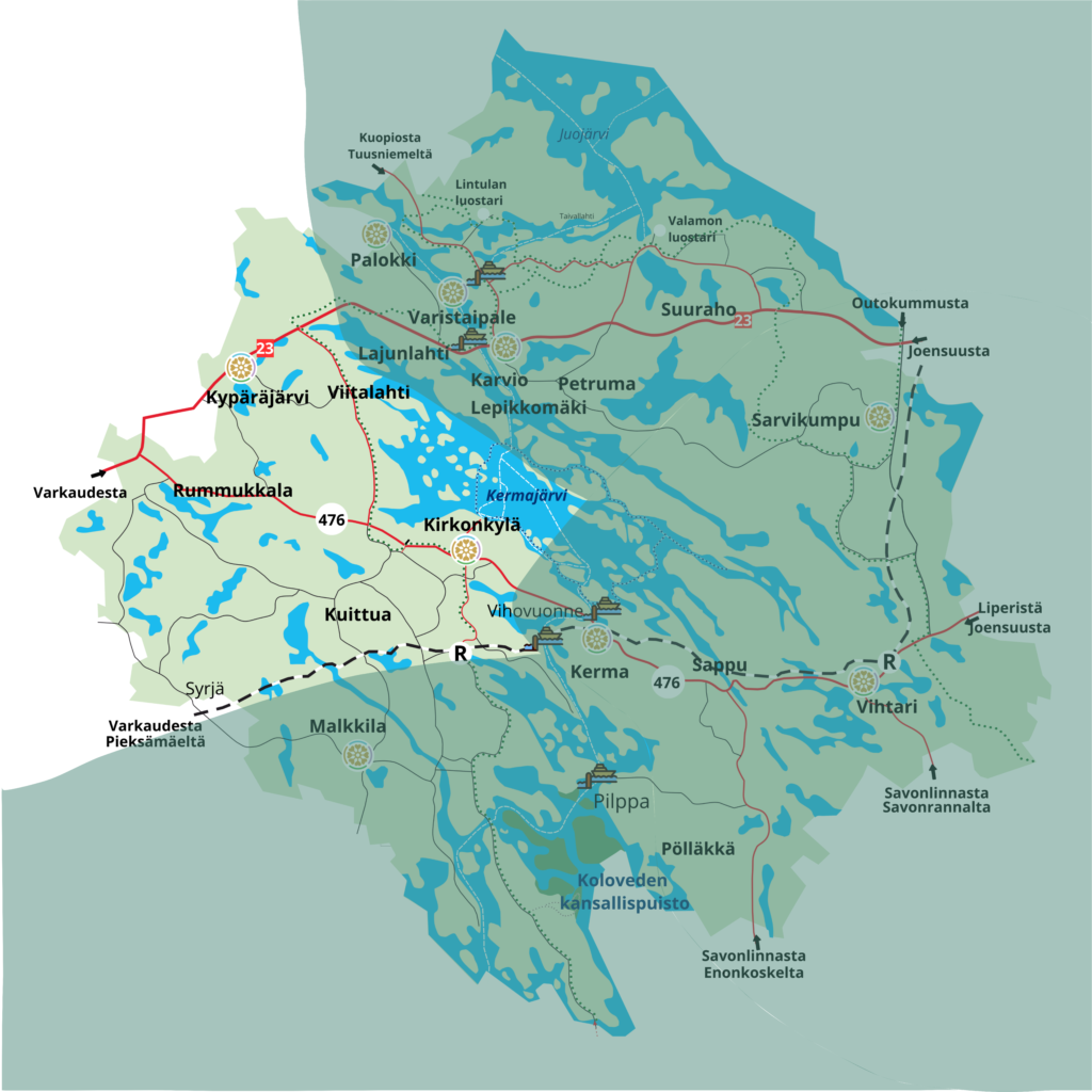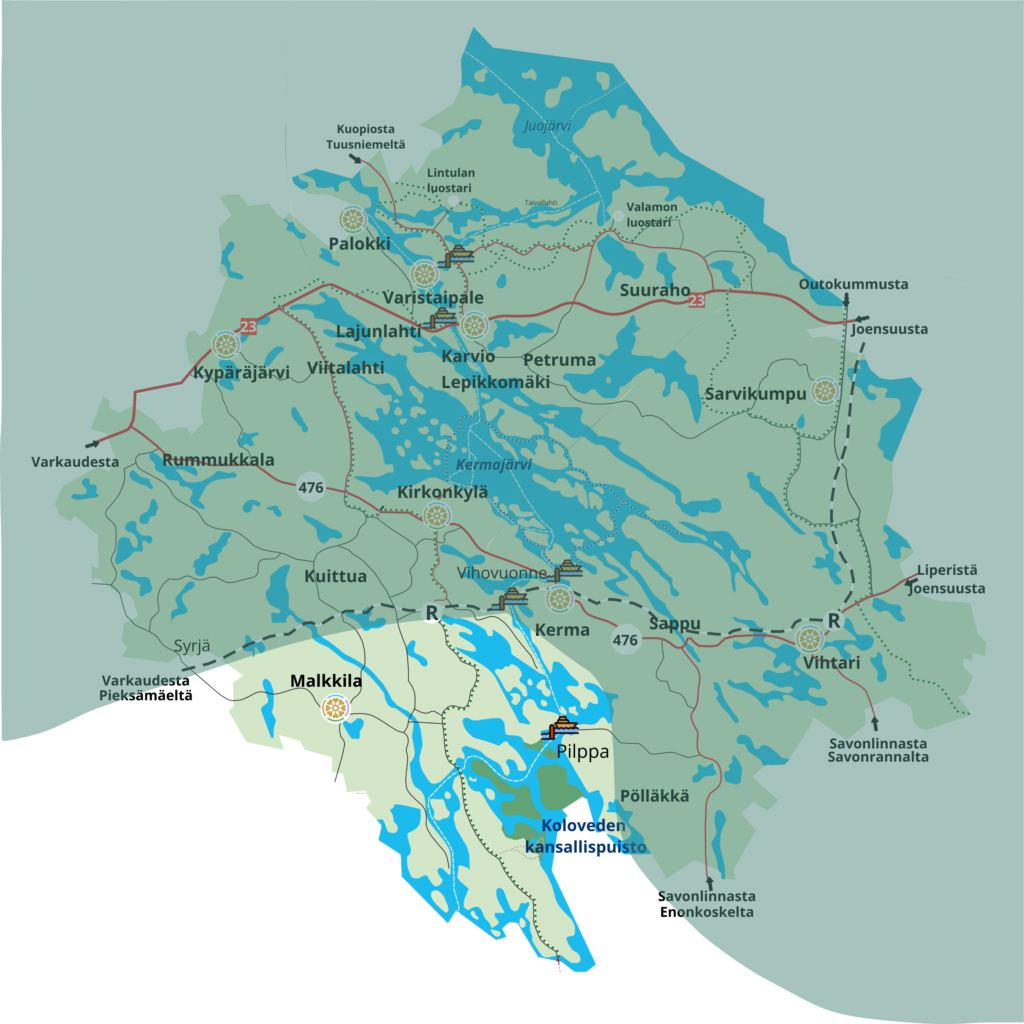 Itäi­nen Heinävesi on monipuo­li­nen ja hel­posti saavutet­ta­va alue, johon kuu­lu­vat Kerma–Sappu–Pölläkkä ‑kyläy­hdis­tyk­sen alue, Vihtarin seu­tu sekä Sarvikumpu. Joen­su­uhun johta­va tie 476 kul­kee alueen kylien hal­ki, ja Vihtaris­sa on myös junapysäk­ki, joten per­ille pääsee suju­vasti niin oma­l­la autol­la kuin julk­isil­la kulku­vä­lineil­lä.
