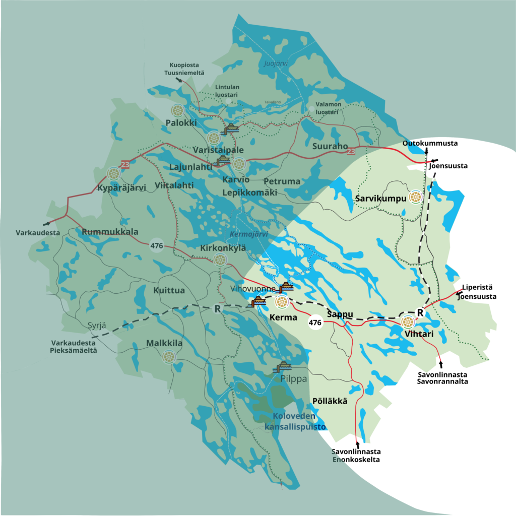 Kerma–Sappu–Pölläkkä on elävä ja yhteisöllinen kyläalue, jossa Kermankosken lavalla koetaan tanssintaikaa ja kesäteatterin nostalgiaa kauniissa koskimaisemissa.