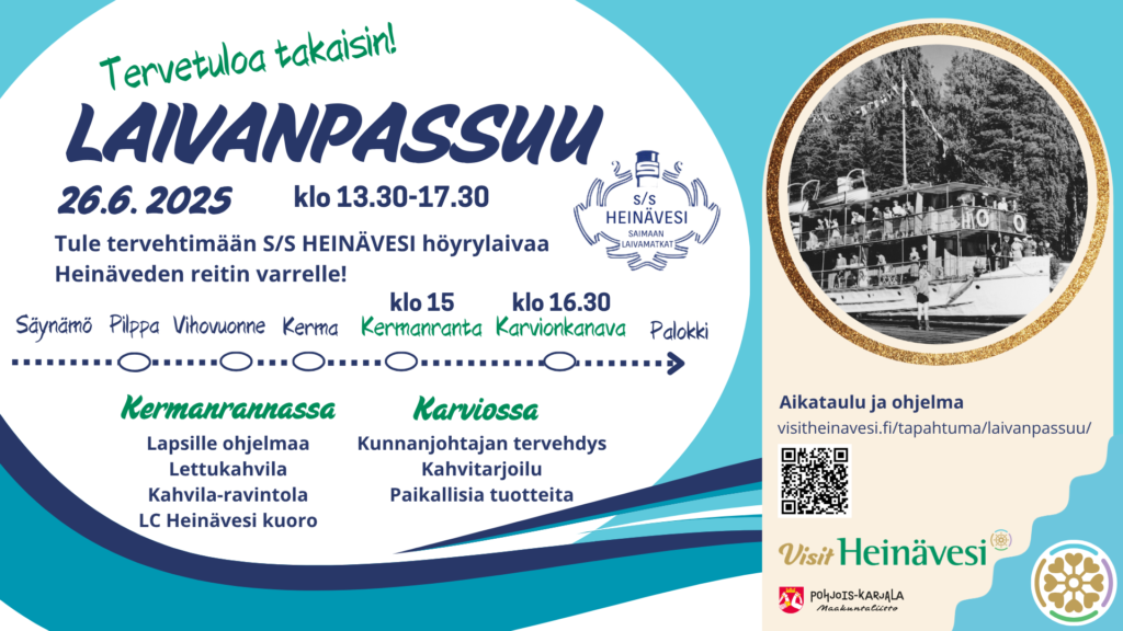 Siksi Heinävedellä juhlistetaankin laivan paluuta reitille kokoontumalla yhteiseen laivanpassuutapahtumaan Heinäveden Kermanrantaan ja Karvion kanavalle torstaina 26.6., jolloin laiva kulkee reitillä ensimmäistä päivää Savonlinnasta Kuopioon.