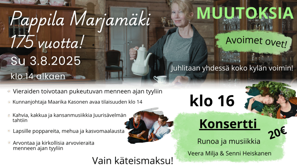 Tervetuloa juhlistamaan Marjamäen pappilan kunnioitettavaa 175 vuoden taivalta sunnuntaina 3.8.2025 koko kylän yhteisessä juhlassa!