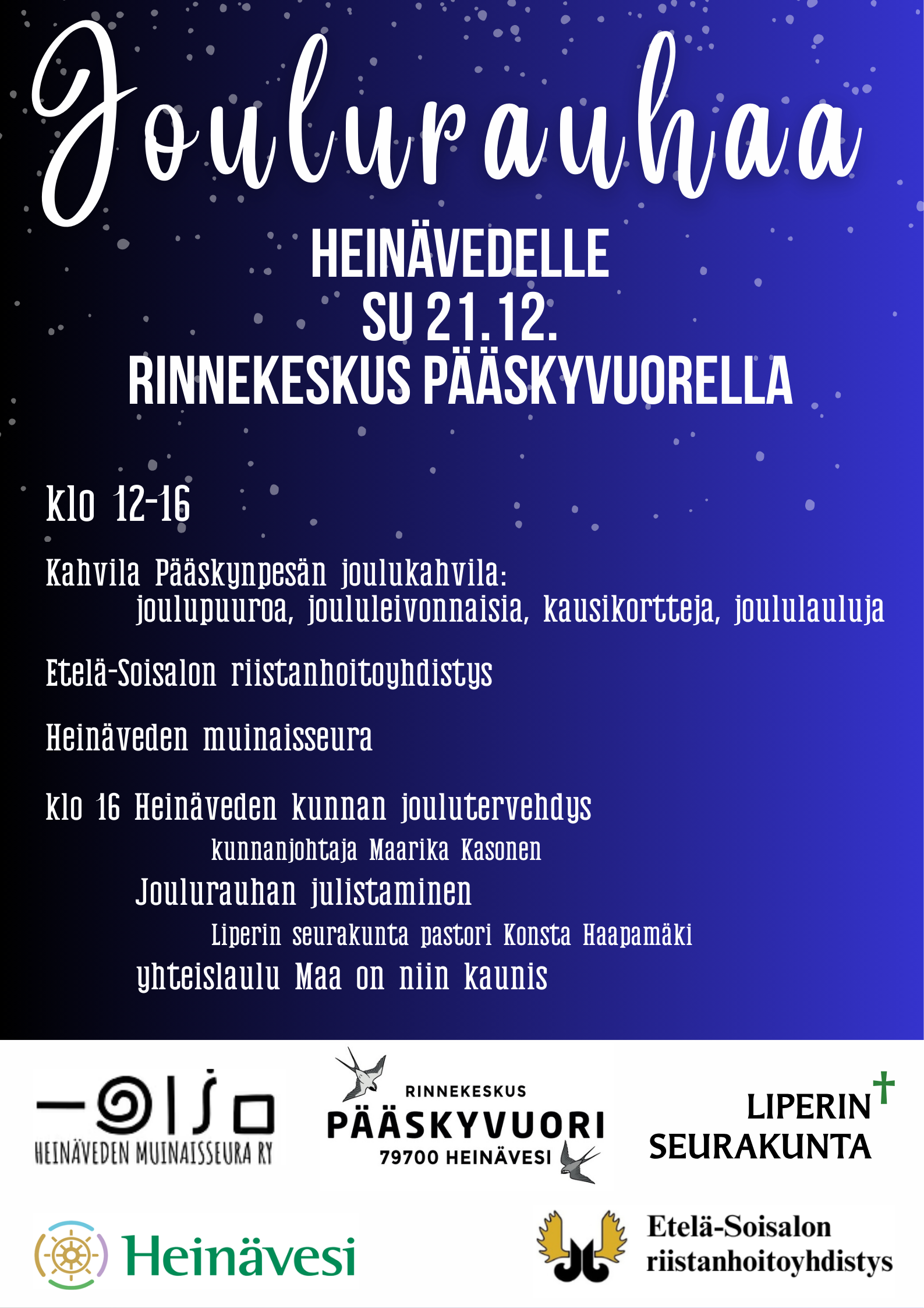 Rinnekeskus Pääskyvuorella. Joulupuuroa, joululeivonnaisia. Mukana Etelä-Soisalon riistanhoitoyhdistys, Heinäveden muinaisseura. Heinäveden kunnan joulutervehdys, Joulurauhan julistaminen ja…